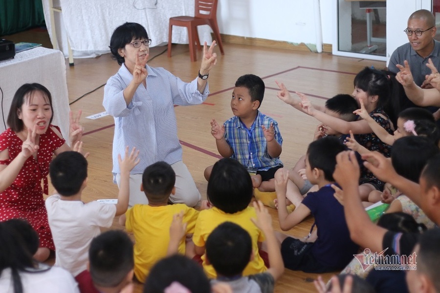 “Với hình ảnh minh họa là cái cầu trượt ngắn thì phụ huynh phát âm từ “trượt” nhanh. Nhưng với hình ảnh cái cầu trượt khác dài hơn gấp đôi thì từ “trượt” khi kể được luyến dài hơn. Và khi cầu trượt thứ ba dài hơn cả 2 cái trước cộng lại thì sẽ đọc kéo dài hơn. Như vậy không đơn thuần đọc để trẻ hiểu mà để trẻ hình dung, phát triển tư duy nhận thức”, bà Koga Masako dẫn chứng.