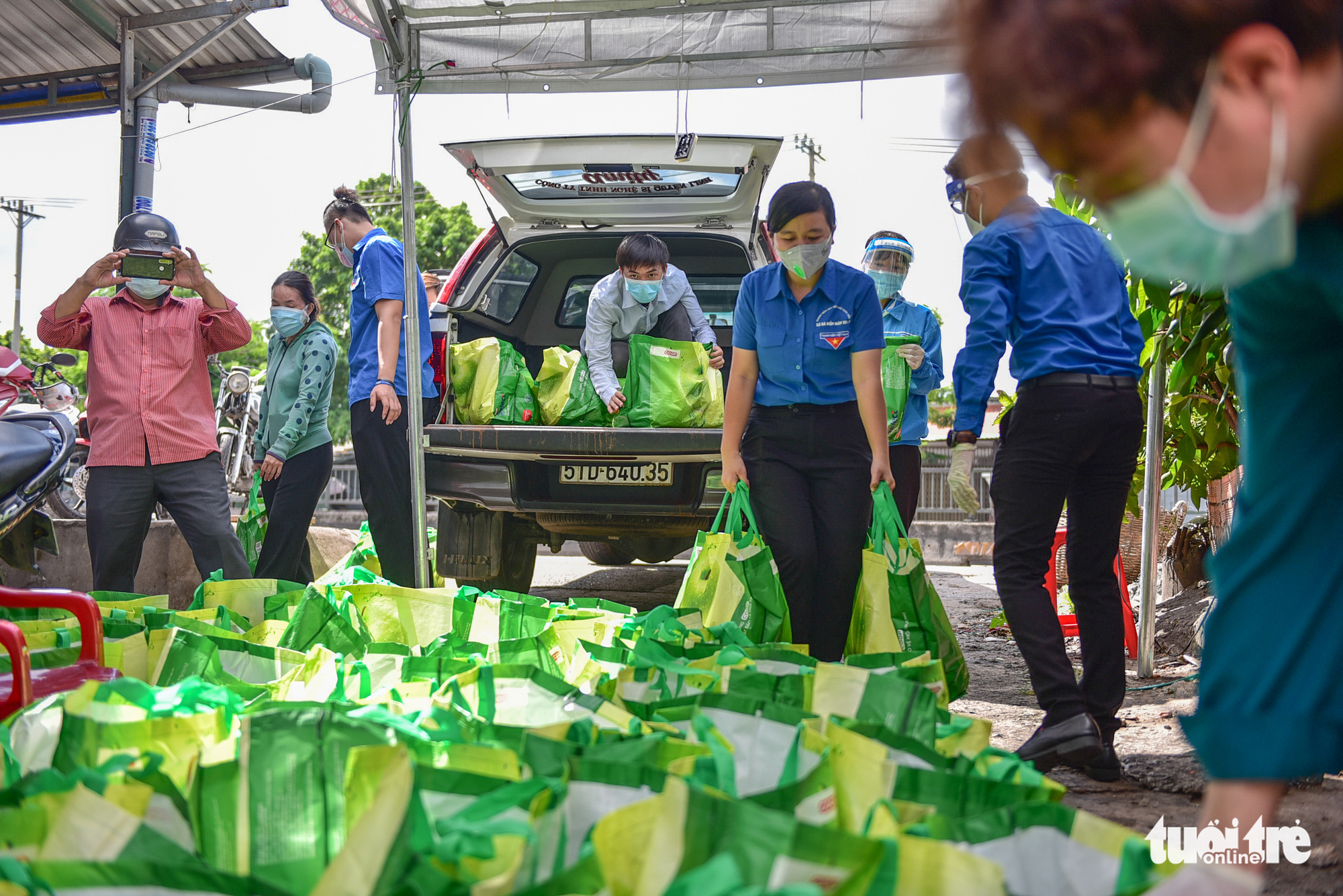 Anh Trần Thanh Tân - phó bí thư Huyện đoàn Hóc Môn - cho biết 500 giỏ quà nghĩa tình đã được Shopee giao đến huyện đoàn và được các đoàn viên thanh niên của huyện đoàn vận chuyển đến 5 điểm phong tỏa để trao cho công nhân, người lao động.