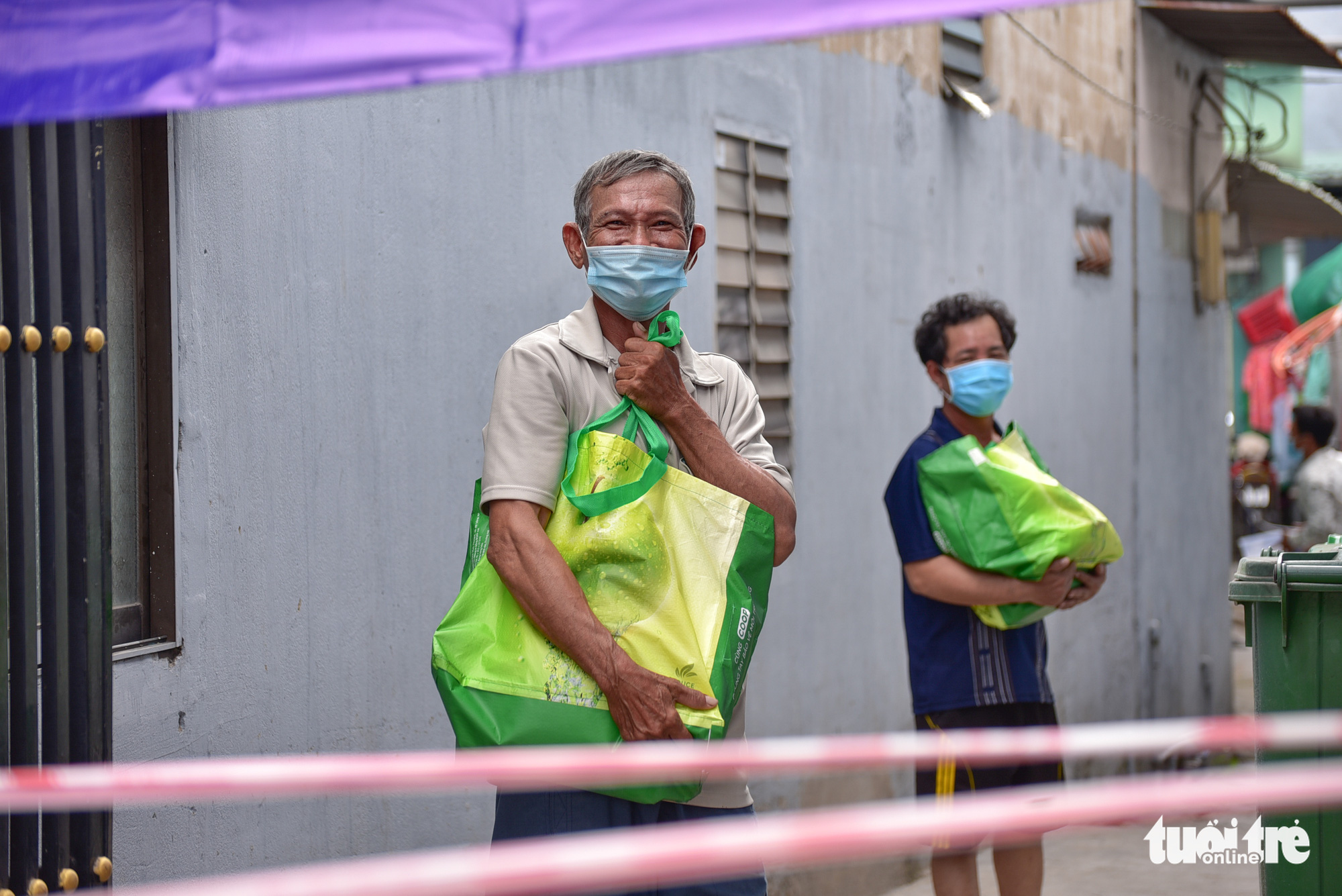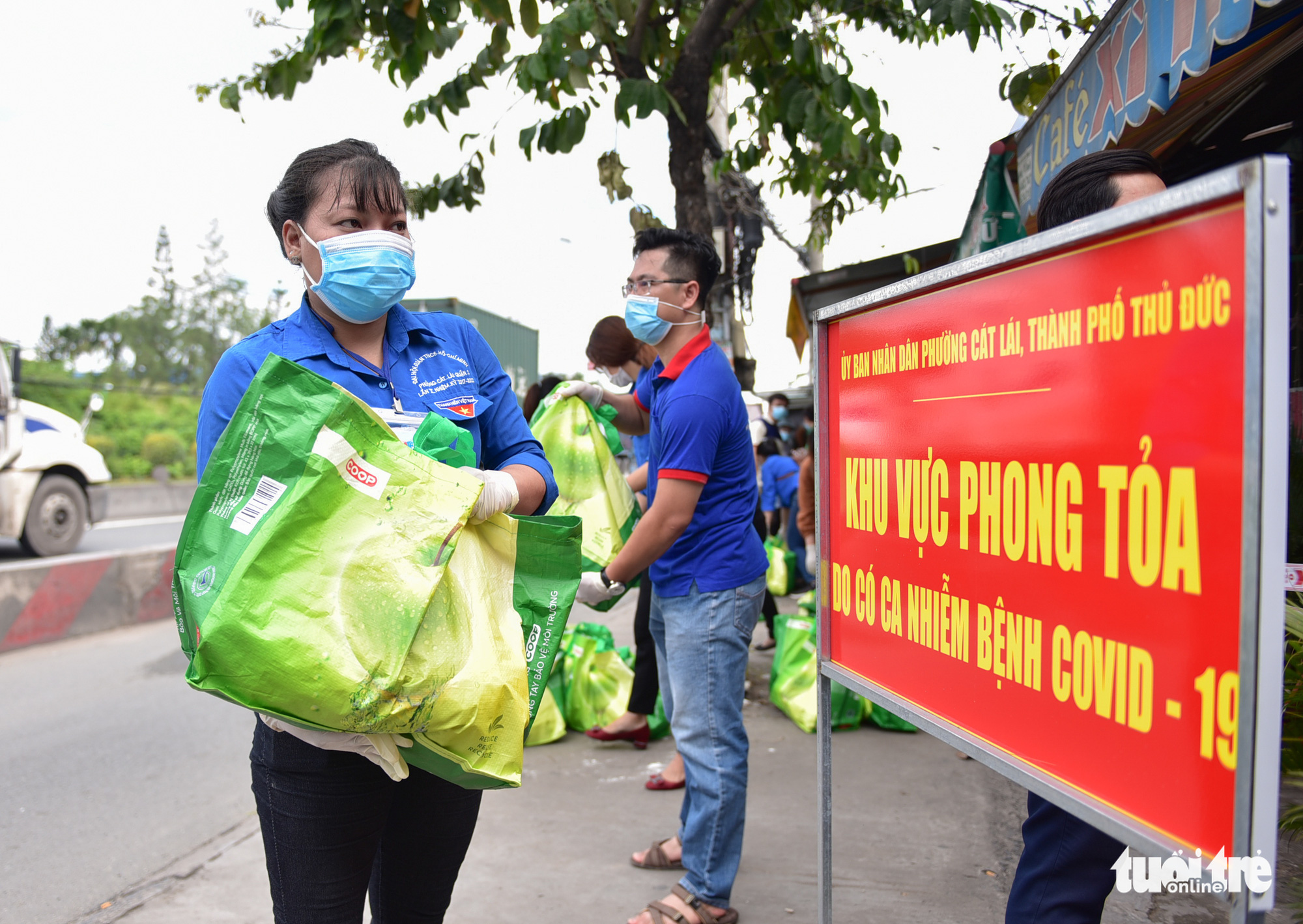 Các phần quà được đoàn viên chuyển đến khu phong tỏa trên đường Đồng Văn Cống (phường Cát Lái, TP Thủ Đức) - Ảnh: NGỌC PHƯỢNG