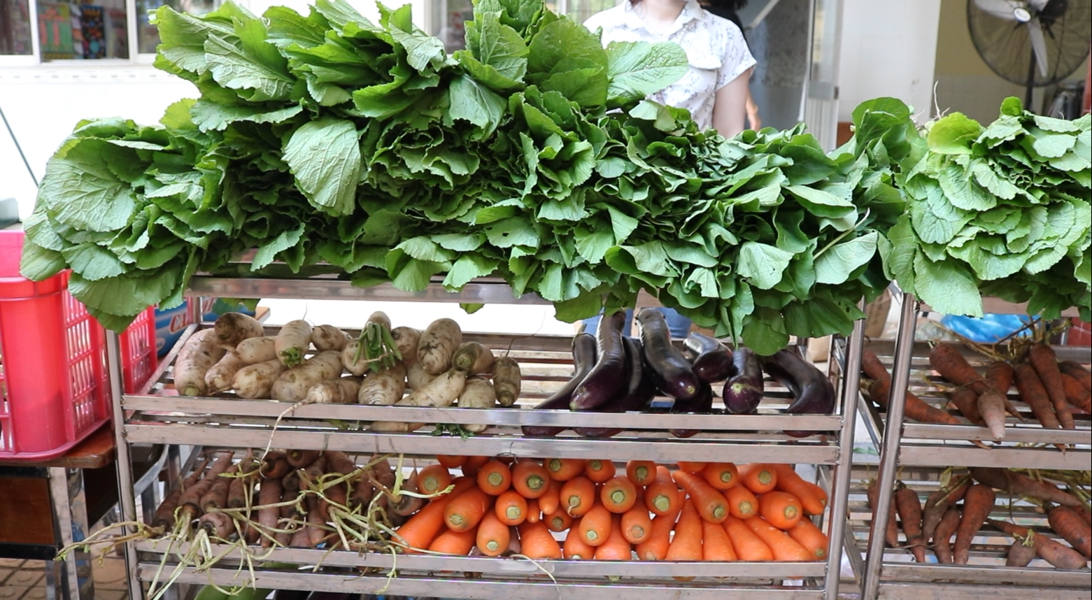 Kệ rau củ xanh mướt được các thầy cô ở Trường tiểu học Ngô Quyền, Cần Thơ sắp xếp cẩn thận. Ai khó khăn thì đến lấy mà không cần trả tiền - Ảnh: NGỌC CHIẾN