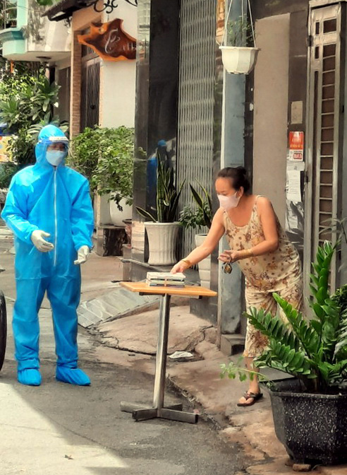 Đội tình nguyện mang sách đến từng nhà ở hẻm 115 Trần Kế Xương (phường 7, quận Phú Nhuận), để trên bàn phía trước và người dân trong khu vực phong tỏa ra nhận - Ảnh: BTC