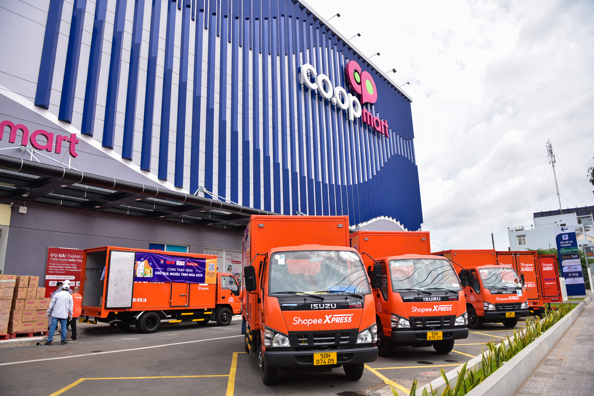 Đội xe chở hàng của Shopee đến siêu thị Co.op Mart Thắng Lợi (quận Tân Phú) để chuyển 2.000 giỏ quà đầu tiên đến các điểm tiếp nhận, để từ đó trao đến tay công nhân, sinh viên, người lao động khó khăn tại TP.HCM - Ảnh: NGỌC PHƯỢNG