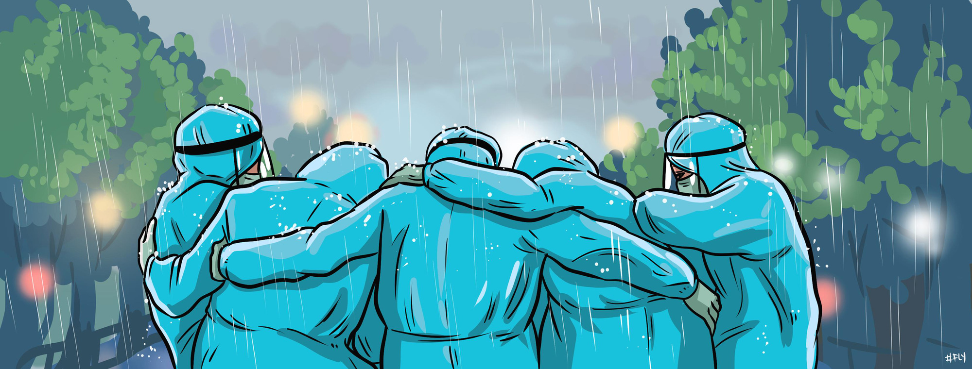 Tấm ảnh trên nhận được nhiều sự đồng cảm từ cư dân mạng. Nhiều họa sĩ đã nhanh tay vẽ lại tấm ảnh này. Họ chúc các anh nhiều sức khỏe và mong dịch bệnh mau giảm, mọi người đã vất vả quá rồi.